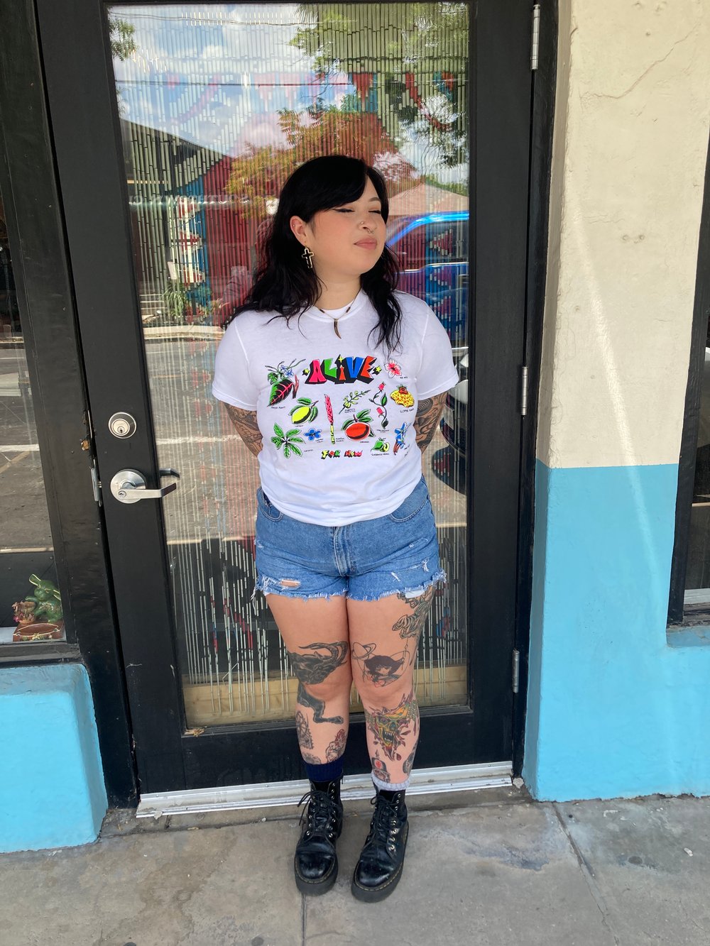 From my Alive..For Now Flash sheet, this design is printed by hand in San Antonio, TX, by Compound Control. This is a 7 screen, 7 color shirt, on the amazing quality Comfort Color shirts.